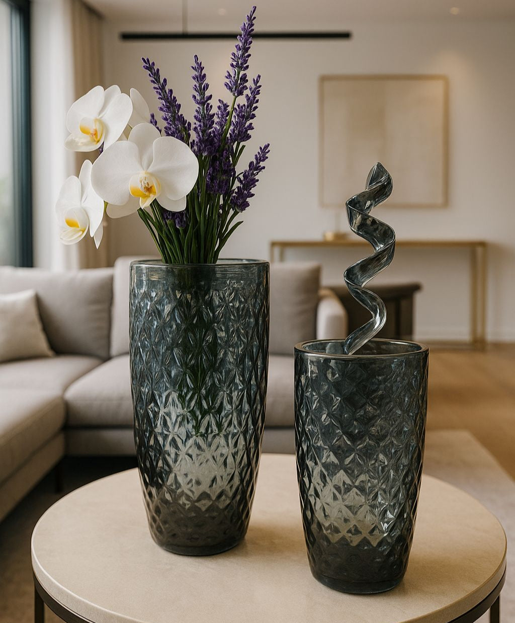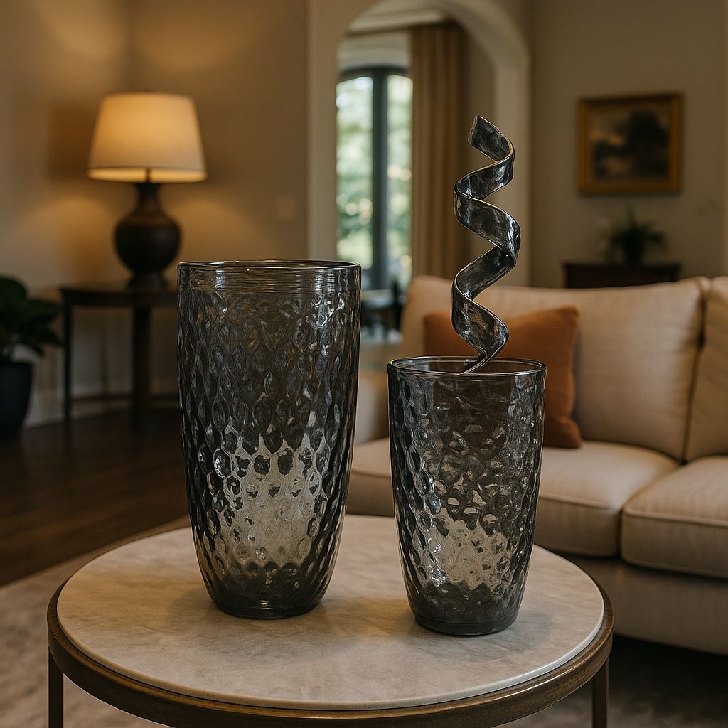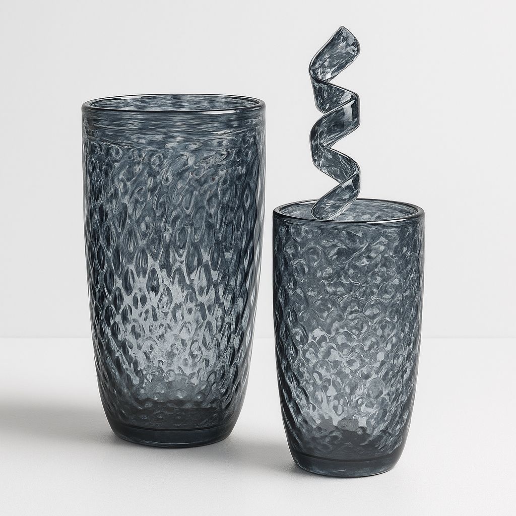Dalgın vazo seti, zarif dalga desenleri ve şeffaf gri tonuyla derin bir huzur ve düşünce hali yansıtıyor. Modern dokunuşlarla harmanlanan bu tasarım, yaşam alanlarına sofistike bir estetik katar.