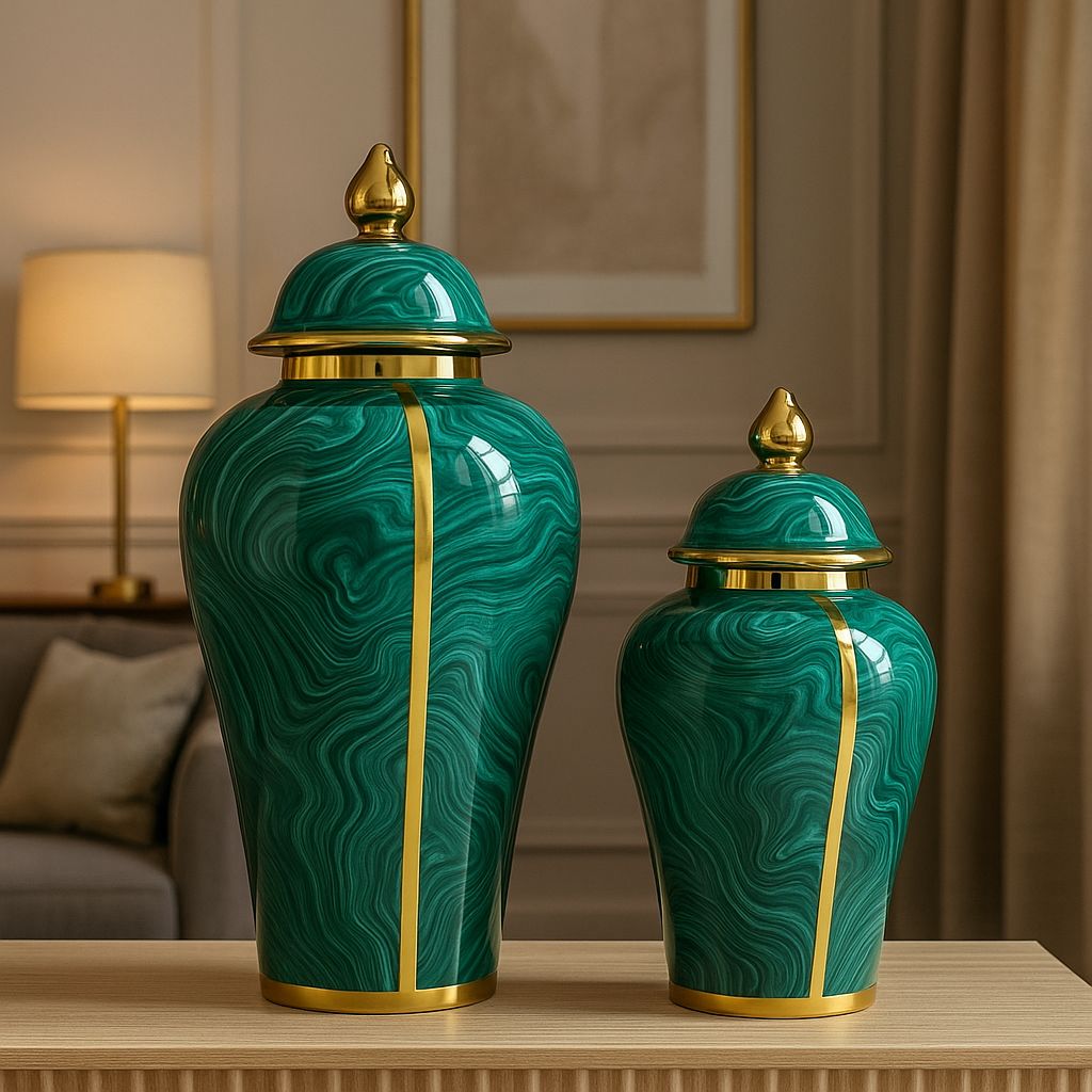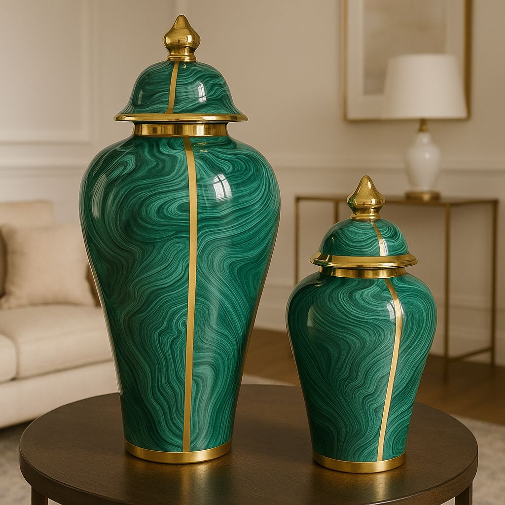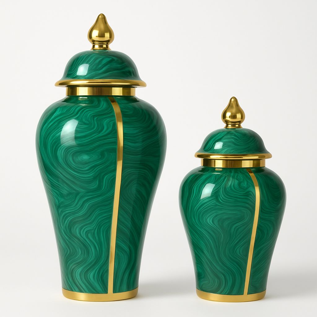 Solara vazosu, zümrüt yeşili mermer desenli yüzeyi ve zarif altın şerit detaylarıyla lüks bir görünüm sunar. Altın kapak ve taban süslemeleriyle tamamlanan bu vazo, klasik ve modern stilin şık bir birleşimidir. Her ortama sofistike bir hava katar.